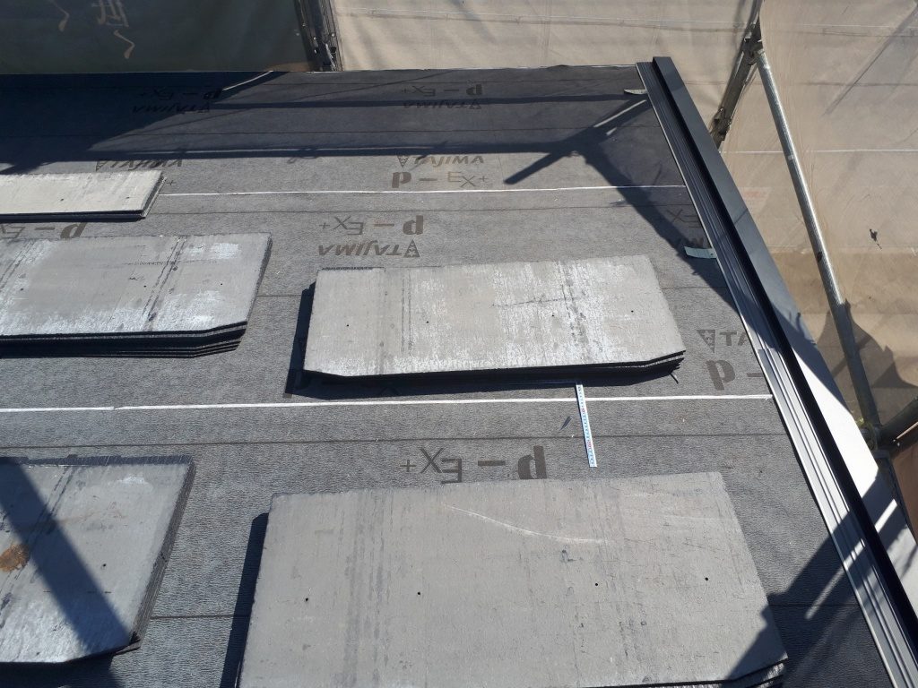 屋根材を施工する前に、下地に防水シートを張り、ぐるりを板金で仕上げます。