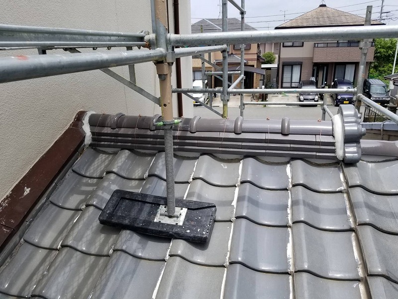 | 工事内容 | 仮設足場交換工事(飛散養生メッシュ込) 棟積替え(新瓦仕様)撤去込 谷板金交換工事(ステンレス仕様) 残材処理(瓦、土、板金) |