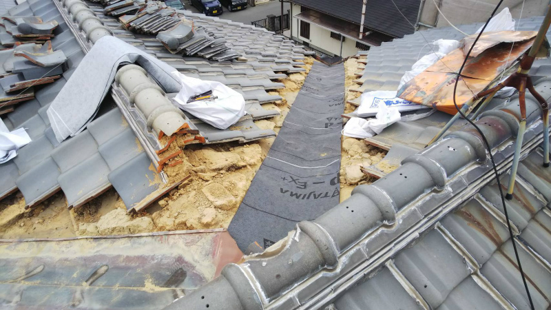 谷板金の両サイドの瓦を撤去して、古い谷板金とまわりの土を撤去します。ルーフィング(防水シート)を施工し、ステンレス仕様の谷板金を施工します。銅より強く錆びにくいです。のし瓦を積んでなんばん漆喰を入れて棟積み替え完了です。