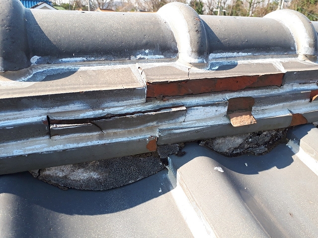 劣化により瓦が割れています。土も見えています。このまま放置していると、そこから雨が浸み込んで雨漏りしてしまいます。