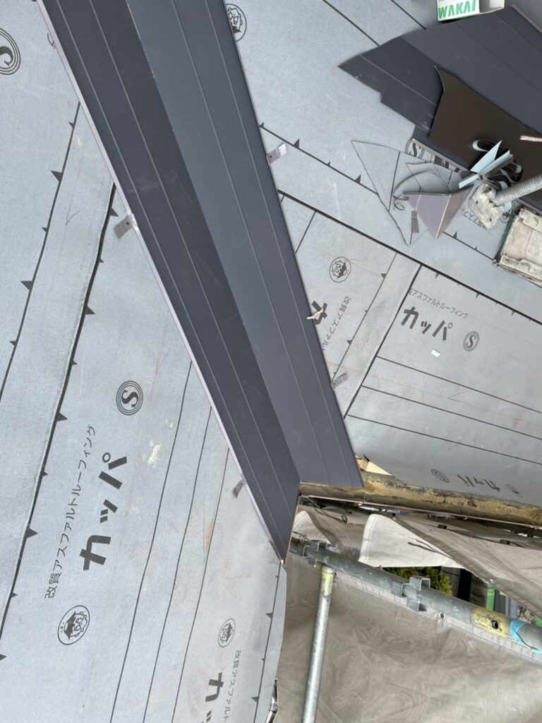 | 工事内容 | 足場設置工事 飛散防止ネット取付 既存瓦(和瓦・土)撤去工事 構造用合板12ミリ新設工事 ゴムアスルーフィング取付(防水紙) ROOGA鉄平本体葺き工事 谷板金工事(ステンレス) 軒先工事 棟部 強力金物+ナンバン仕上げ ケラバ工事 捨て水切り工事 雨押え板金工事 既存樋撤去工事 軒樋工事 竪樋工事 波板工事 足場解体 |