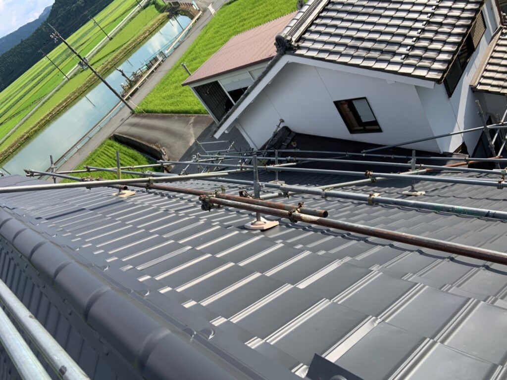 矩勾配(急勾配)の屋根の場合、屋根の上の方まで足場を組む必要があります。屋根面にかかっている足場が無いと登れないので必須です。