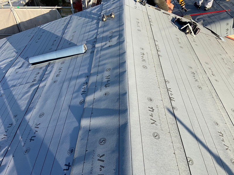 ルーフィングシート(防水シート)を貼り付けます。【改質アスファルトルーフィング下葺材】を使用。