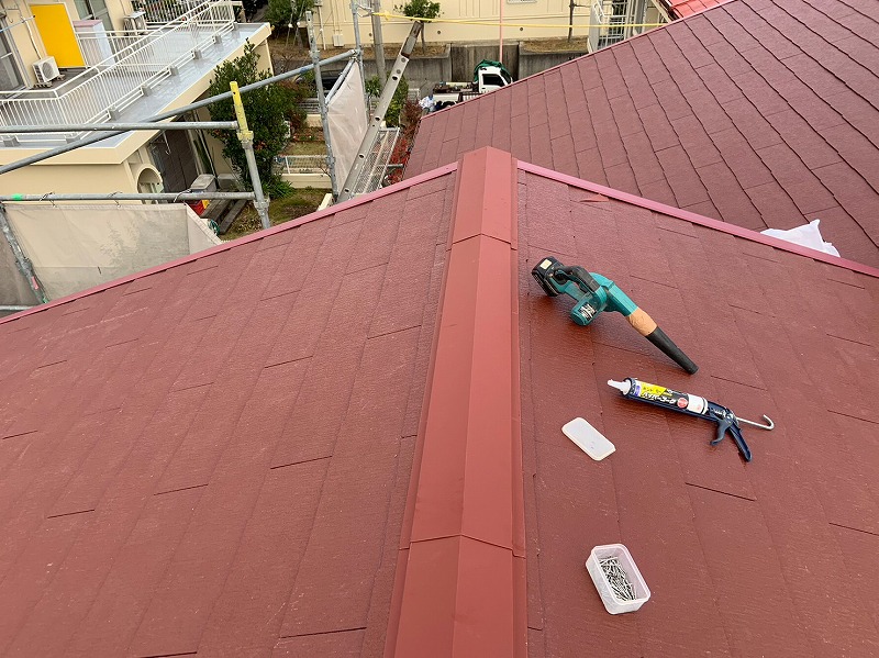 | 工事内容 | 【仮設足場】 仮設足場工事 【屋根工事】 既存屋根撤去工事 ルーフィング工事 カラーベスト葺き工事 ケラバ板金工事 谷板金工事 棟板金工事 雨押え水切り工事 |